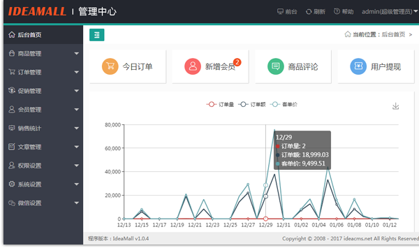 我們開發(fā)的商城系統(tǒng)是基于tp5+weui+layui于2017年全新開發(fā)的系統(tǒng)。此系統(tǒng)依然繼承了我們做小而美產(chǎn)品的基因,整個(gè)系統(tǒng)打包不到7M卻擁有購物、分銷、促銷、會員、積分、文章、公眾號管理幾大模塊。