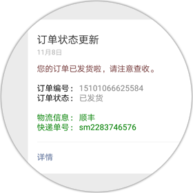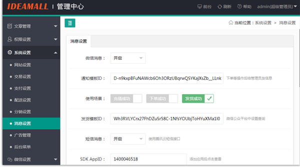 您可以在用戶充值、用戶下單等場景下開啟消息提醒功能,支持短信及微信模板消息。讓訂單處理更快速!