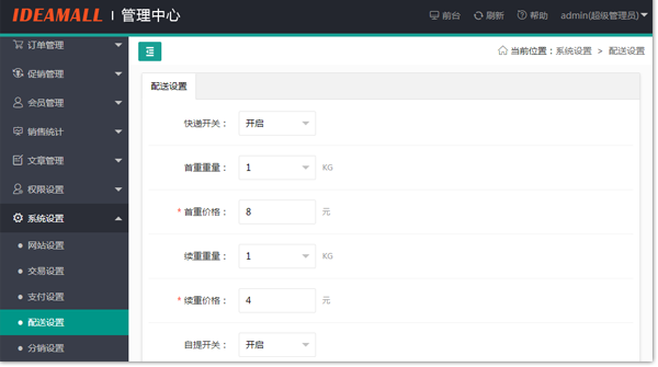 可在后臺自由開啟,同時(shí)開啟后,本地用戶可選擇自提,外地客戶選擇快遞。讓取貨方式更加多樣化!